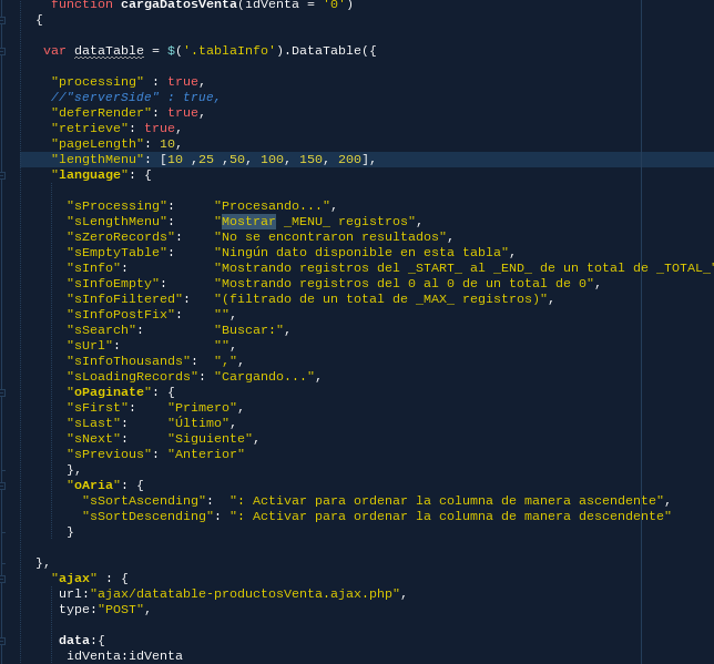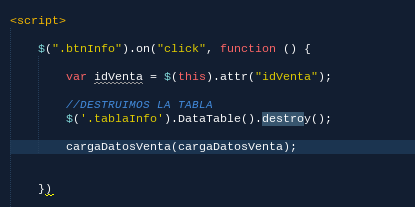 Ahora falta que nos muestre la información de la venta así que desde la vista creamos la función cargaDatosVenta, en la cual mandamos invocar mediante AJAX los datos de la venta