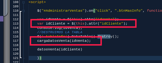Ahora falta que nos muestre la dirección del cliente, en el archivo datatable-administrarVentas.ajax.php en el mismo boton btnMasInfo agregamos el atributo del id_cliente