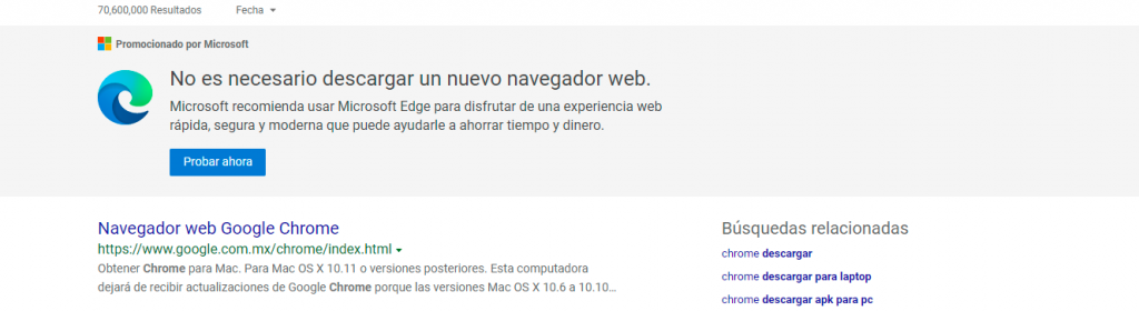 Llama la atención que al buscar chrome en el explorador web que esta instalado en windows “Edge” sale el siguiente mensaje