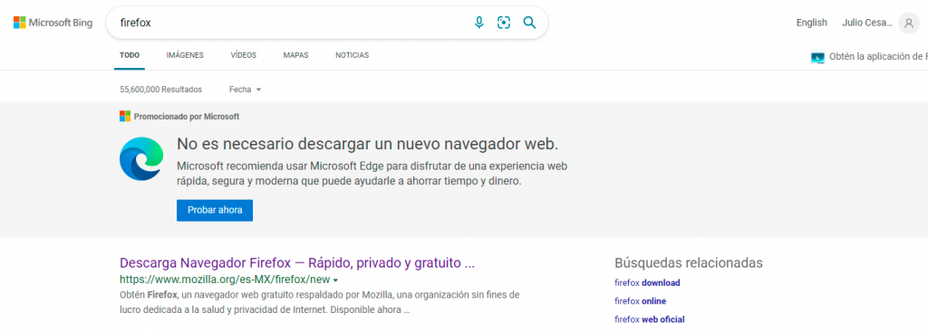 Si preferimos Firefox podemos instalarlo también, al igual al intentarlo buscar en Bing vemos como nos sale el siguiente mensaje