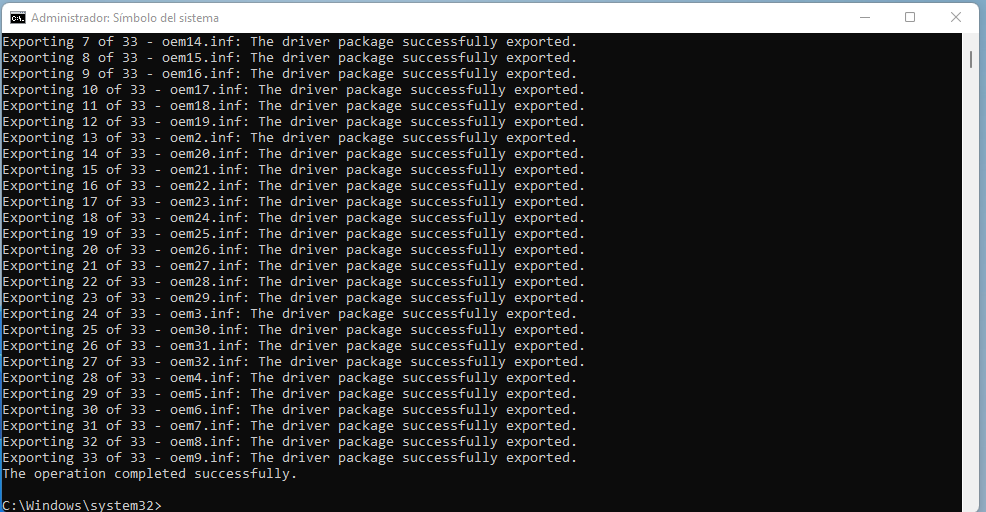 Ahora para restaurar los drivers en caso de haber formateado usamos el siguientes comando, igual d:\controladores es donde están los controladores